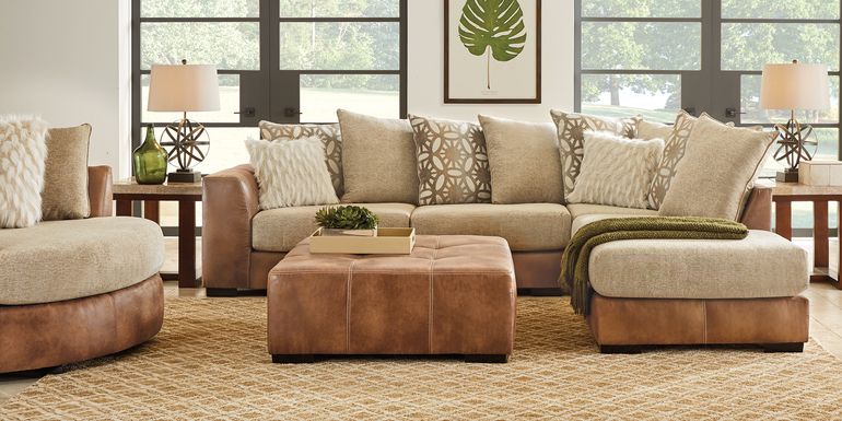 Contemporary beige sectional with a dark brown leather upholstered base and oversized beige and brown pillows on a gray rug. And tufted linen upholstery this beige sofa is sophisticated and traditional. For formal seating areas consider beige living room sets with sumptuous genuine leather or fine fabric upholstery such as linen chenille or velvet.